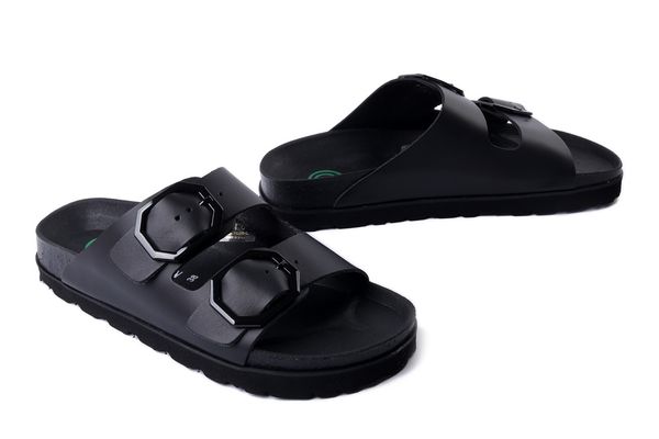 Klapki damskie. Naturalna skóra. Wkładka typu fusbet. Zapięcie na dwie klamerki. Lekka, wygodna podeszwa. Tęgość G.
