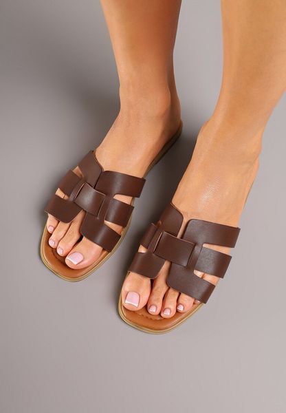 Ciemnobrązowe Klapki na Płaskiej Podeszwie z Przeplataną Cholewką Filadea