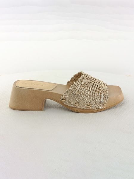 – zapięcie: bez- noski: otwarte- powierzchnia: z metalicznym połyskiem- detale: plecionka, ozdobne nity- forma obcasa: blokowy- podeszwa: antypoślizgowa