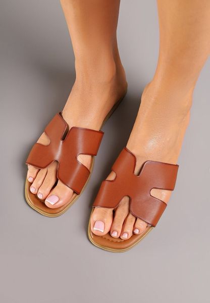 Brązowe Minimalistyczne Klapki na Płaskiej Podeszwie Zdobione Wycięciami Filazzia