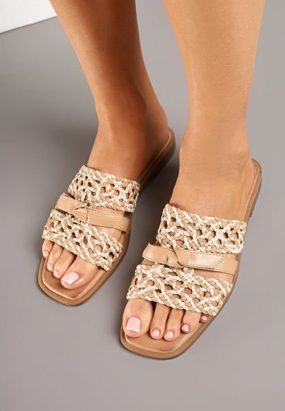 Beżowe Klapki Ażurowe Zdobione Wiązaniem Koritessa
