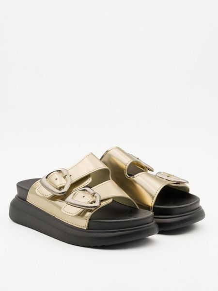 – zapięcie: sprzączka- noski: otwarte- powierzchnia: z metalicznym połyskiem- wkładka: ergonomicznie formowana- forma obcasa: platforma- podeszwa: antypoślizgowa
