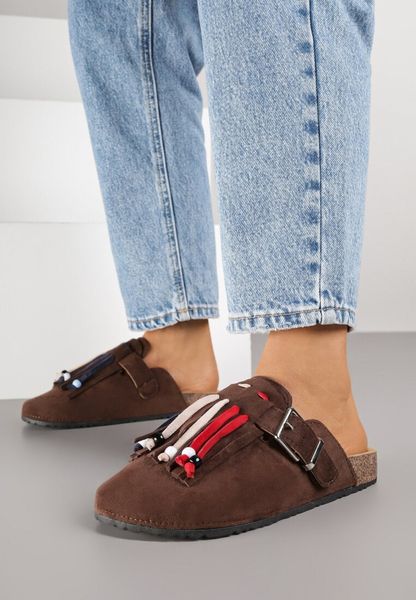 Brązowe Klapki Mule w Stylu Boho z Ozdobnymi Frędzlami Varre