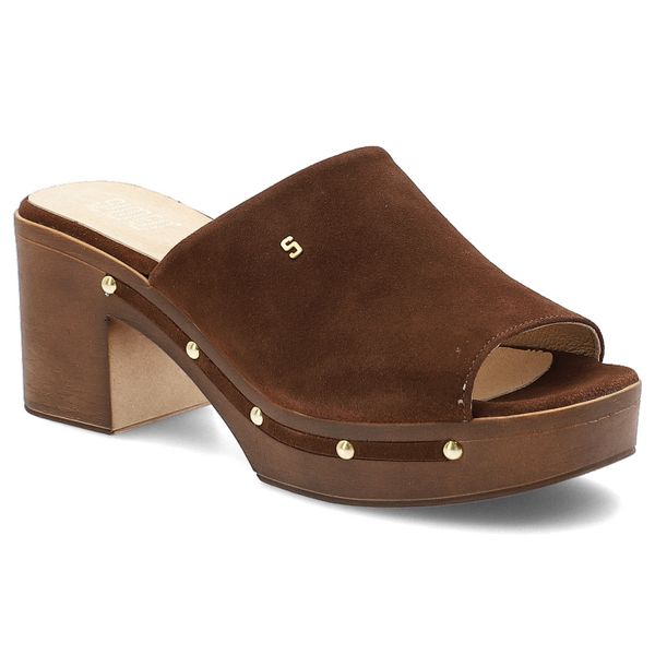 Klapki damskie Simen, skórzane na klocku z ozdobami eleganckie, brązowe, 6844A-K-W