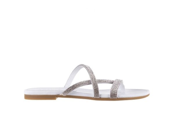 Japonki marki Bayla wykonane ze skóry naturalnej w kolorze białym.Skrzyżowane trzy cienkie paski wykonane z naturalnej skóry zamszowej ozdobione błyszczącymi koralikami transparentnego koloru. Wkładka ze skóry naturalnej koloru białego. Bardzo lekkie i elastyczne.Buty Bayla będą idealną propozycją na upalne dni.Długość wkładki dla rozm. 38 – 24,5 cmKolor metali: transparentnyWysokość obcasa: 2 cm