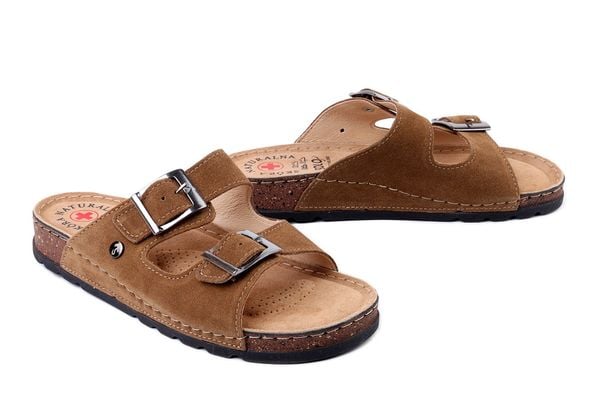 Klapki damskie. Naturalna skóra. Skórzana, miękka, wyprofilowana, częściowo perforowana wkładka. Zapięcie na dwie klamerki.