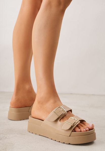 Ciemnobeżowe Klapki na Grubej Podeszwie z Dwoma Klamrami Xenienne