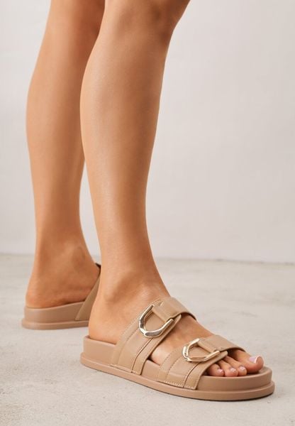 Ciemnobeżowe Klapki z Metalicznymi Klamrami Eudare