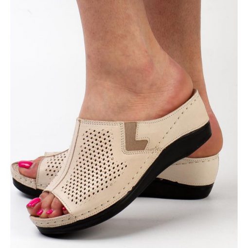 Beżowe skórzane klapki damskie na koturnie T.Sokolski L25-157