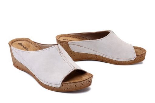 Klapki damskie. Miękka, skórzana wkładka. Guma ściągająca. Wygodny, stabilny koturn.