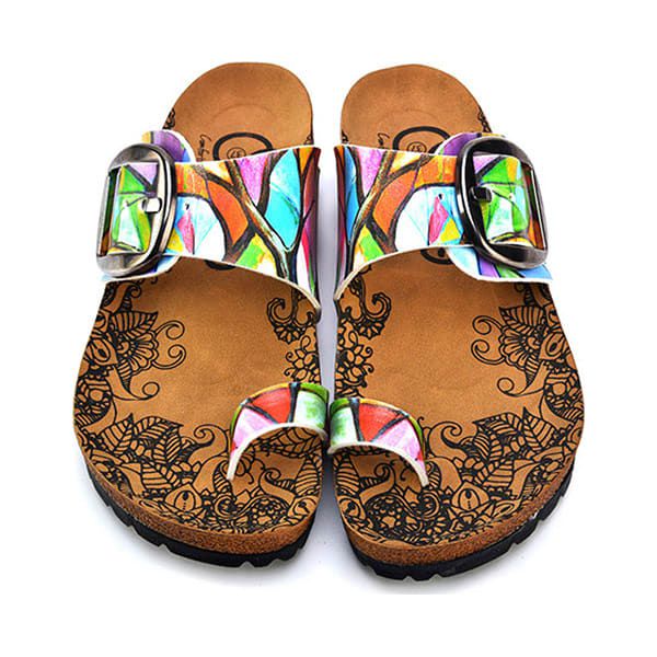 – zapięcie: sprzączka- noski: otwarte – powierzchnia: wzorzysta – wyściełana wkładka- podeszwa: antypoślizgowa