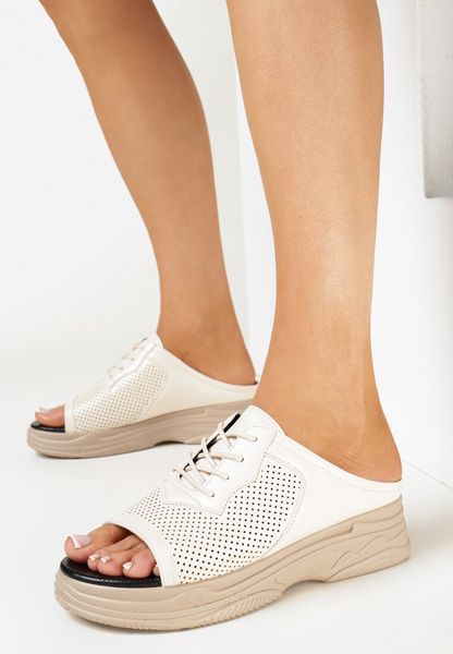 Beżowe Klapki na Płaskiej Podeszwie z Perforacją i Wiązaniem Edenna