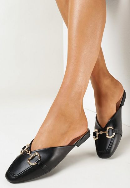 Czarne Klapki Mule na Płaskiej Podeszwie z Łańcuchem Evandia