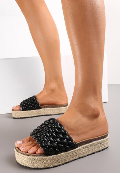 Czarne Klapki na Platformie z Plecionki z Juty Naredia
