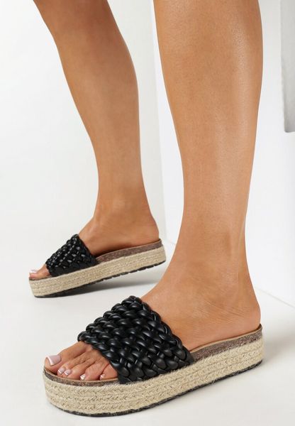 Czarne Klapki na Plecionej Platformie z Przeplatanym Paskiem Eudolena