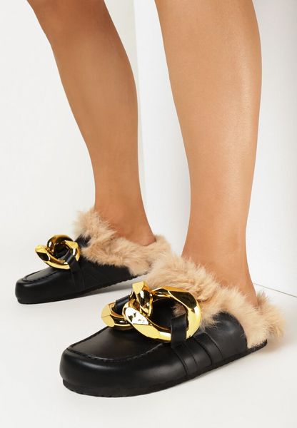 Czarne Klapki na Płaskiej Podeszwie z Ozdobnym Sztucznym Futerkiem i Łańcuchem Cygene