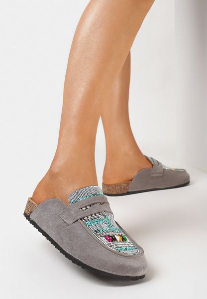 Szare Klapki Mule na Korkowej Podeszwie Ozdobione Koralikami Enoria