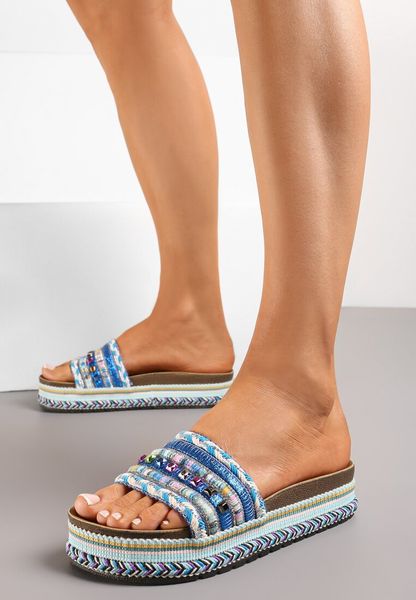 Niebieskie Klapki na Niskiej Platformie Ozdobione Metaliczną Nicią i Brokatem Evandie