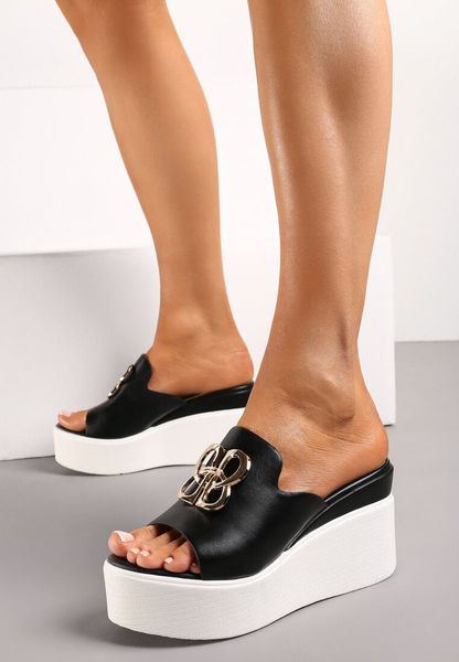 Czarne Klapki na Koturnie i Platformie z Metalową Ozdobą Ternnia