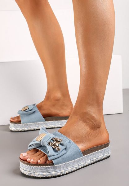 Jasnoniebieskie Klapki na Ozdobnej Podeszwie z Kokardą i Metalicznymi Detalami Silgara