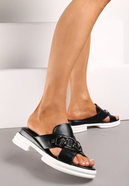 Czarne Klapki na Grubej Podeszwie z Metaliczną Klamrą Runetia