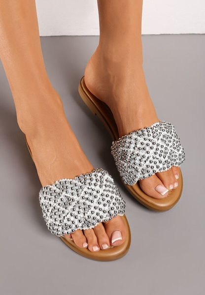 Białe Płaskie Klapki z Elegancką Plecionką z Koralików Waldase