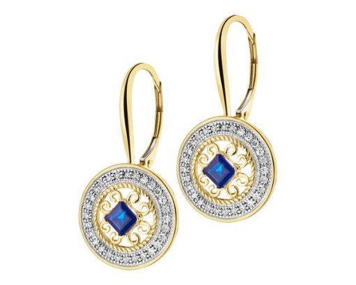 Kolczyki z żółtego złota z diamentami i szafirami – rozety – próba 585 – 160.497. Żółte złoto rodowane