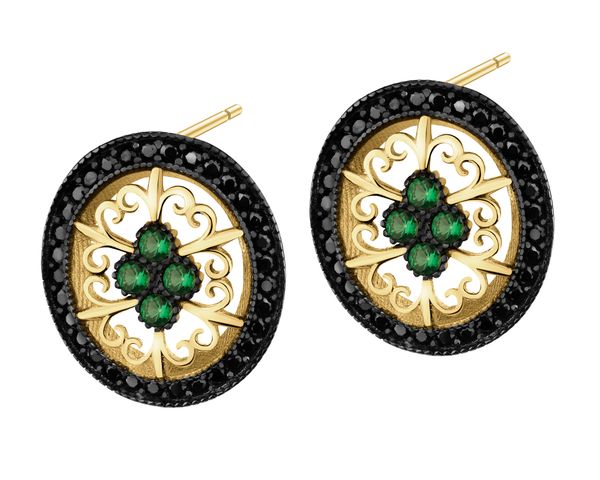 Złote kolczyki z cyrkoniami – rozety – AP539-4132. Żółte złoto, czarny rod
