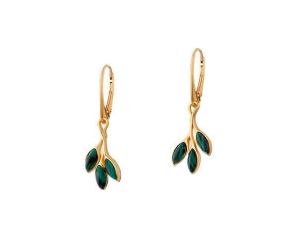 Kolczyki srebrne z malachitem – liście – AP534-1729. Srebro pozłacane