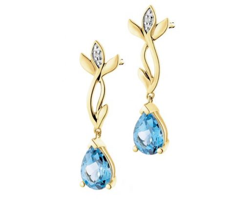 Kolczyki z żółtego złota z diamentami i topazami – liście – próba 585 – 110.919. Żółte złoto rodowane