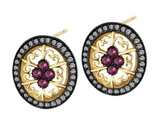 Złote kolczyki z cyrkoniami – rozety – AP539-4134. Żółte złoto, czarny rod