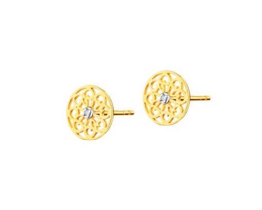 Kolczyki z żółtego złota z diamentami – rozety – 0,01 ct – próba 375 – 110.438. Żółte złoto rodowane