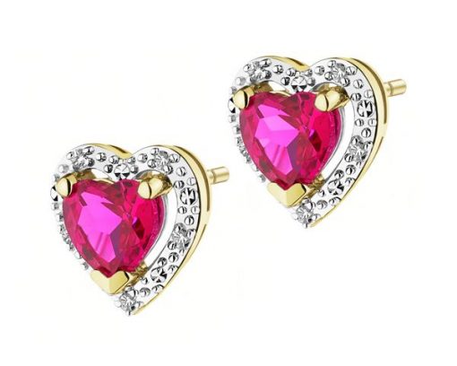 Kolczyki z żółtego złota z diamentami i rubinami syntetycznymi – serca – próba 375