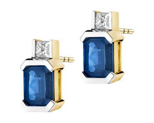 Kolczyki z żółtego złota z diamentami i szafirami – próba 585 – 803. Żółte złoto rodowane