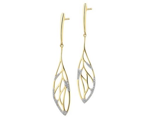 Kolczyki z żółtego złota z diamentami – liście – 0,12 ct – próba 585 – 214.102. Żółte złoto rodowane