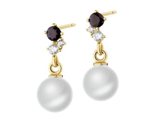 Złote kolczyki z perłami, szafirami syntetycznymi i cyrkoniami