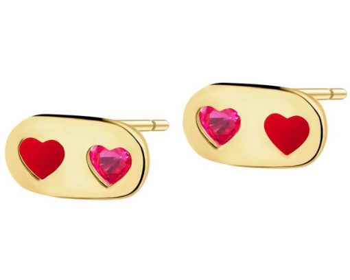 Złote kolczyki z rubinami syntetycznymi i emalią – serca