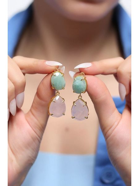 – materiał: mosiądz- powłoka: złoto- zapięcie: pin- rodzaj kamienia 1: amazonit- rodzaj kamienia 2: kwarc- kolor kamienia: jasnozielony, jasnoróżowyWskazówka: Zdjęcie produktu w powiększeniu.