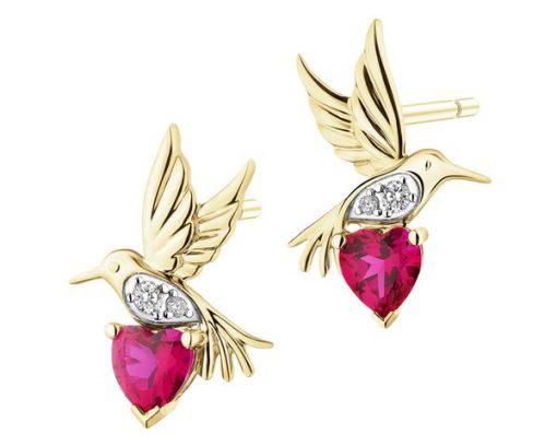 Kolczyki z żółtego złota z brylantami i rubinami syntetycznymi – kolibry, serca – próba 375
