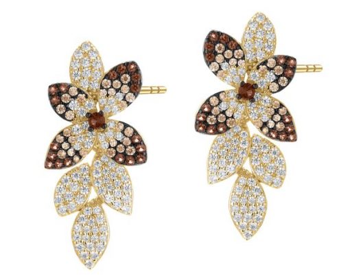 Kolczyki srebrne z cyrkoniami – kwiaty, liście – AP542-2838. Srebro pozłacane, czarny rod