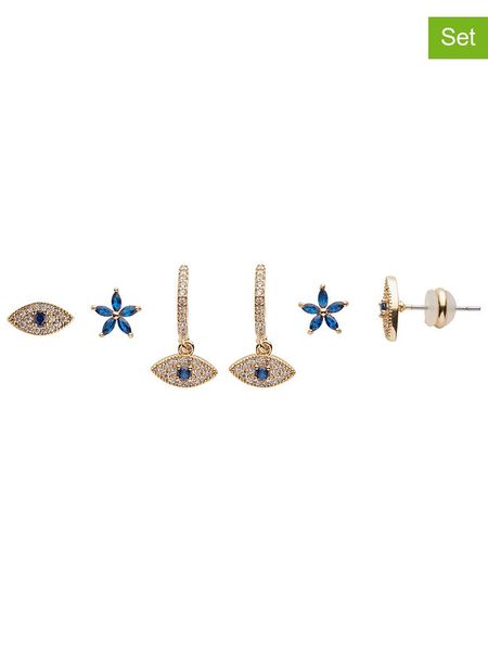 W zestawie:- 3 różne pary kolczyków1 i 2 para:- materiał: metal- powłoka: złoto- zapięcie: pin- rodzaj kamienia: kryształ- kolor kamienia: bezbarwny, niebieski3 para:- materiał: metal- powłoka: złoto- zapięcie: wtyk- rodzaj kamienia: kryształ- kolor kamienia: bezbarwny, niebieskiWskazówka: Zdjęcie produktu w powiększeniu.