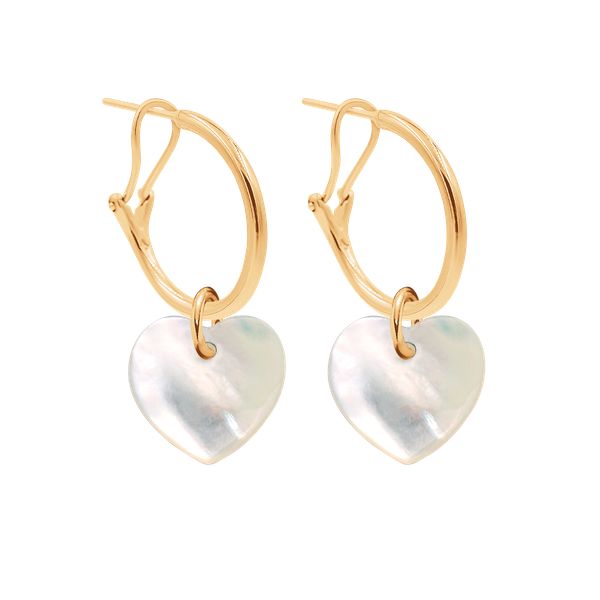 Zestaw zawiera dwie zawieszki w kształcie serca wykonane z masy perłowej i kolczyki koła. Wielkość zawieszki: 1,5 cmWielkość kolczyków: 2 cm Kolczyki wykonane ze stali pozłacanej 18-karatowym złotem.