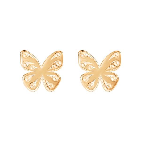 Kolczyki sztyfty motyle Etincelle o wielkości 0,6 cm. Motyl jest symbolem wolności i beztroski. Kolczyki wykonane są ze stali szlachetnej pokrytej 18-karatowym złotem.