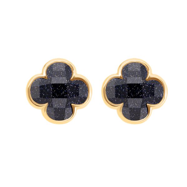 Kolczyki Mini Icons w kształcie koniczyny z czarnym brokatowym szkłem kryształowym, pozłacane. Wielkość kolczyków: 1 cm Kolczyki wykonane są ze stali szlachetnej pokrytej 18-karatowym złotem.