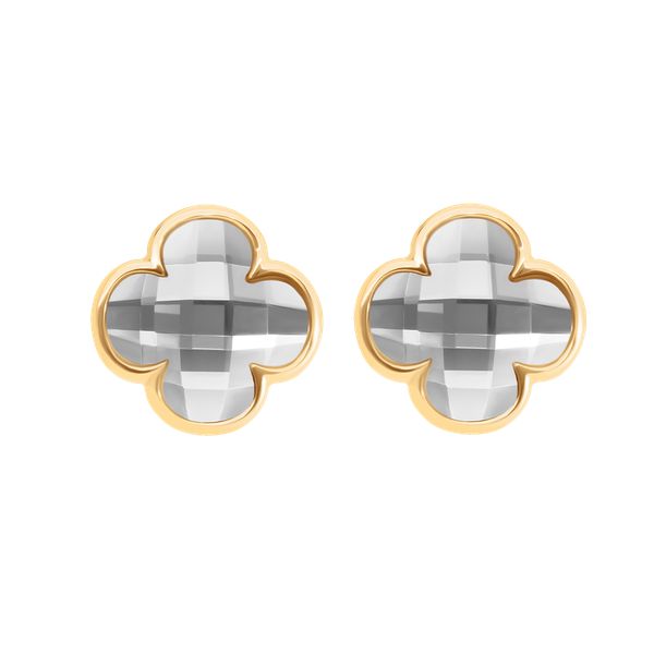 Kolczyki Mini Icons w kształcie koniczyny z ciemnoszarym szkłem kryształowym, pozłacane. Wielkość kolczyków: 1 cm Kolczyki wykonane są ze stali szlachetnej pokrytej 18-karatowym złotem.