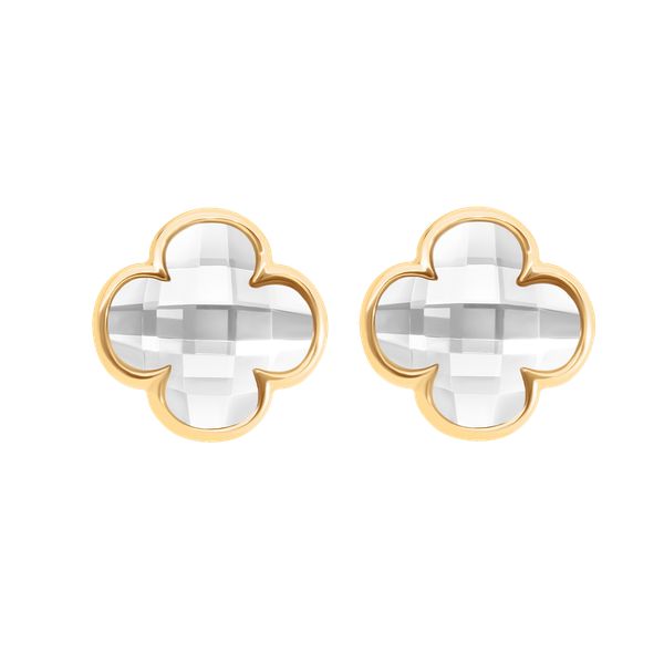 Kolczyki Mini Icons w kształcie koniczyny z białym szkłem kryształowym, pozłacane. Wielkość kolczyków: 1 cm Kolczyki wykonane są ze stali szlachetnej pokrytej 18-karatowym złotem.