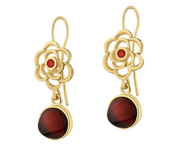 Kolczyki srebrne z bursztynem i rubinami syntetycznymi – AP544-6973. Srebro pozłacane