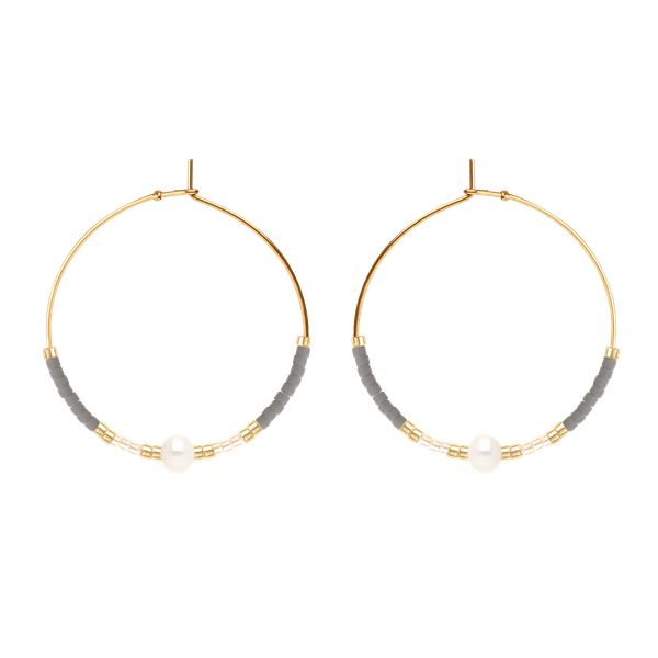 Kolczyki koła z japońskimi koralikami Miyuki w kolorze szarym z białymi perłami. Wielkość kolczyków: 2,5 cm Kolczyki wykonane są ze stali szlachetnej pokrytej 18-karatowym złotem. Perła słodkowodna hodowana.