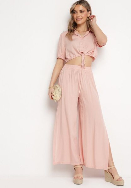 Jasnoróżowy Bawełniany Komplet z Krótką Koszulą i Szerokimi Spodniami z Rozcięciami Denara