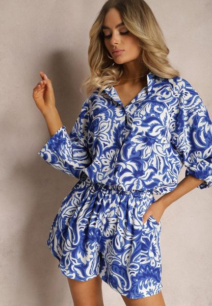 Granatowo-Biały Dwuczęściowy Komplet Koszula z Długim Podpinanym Rękawem Szorty z Gumką w Talii Bellafaie